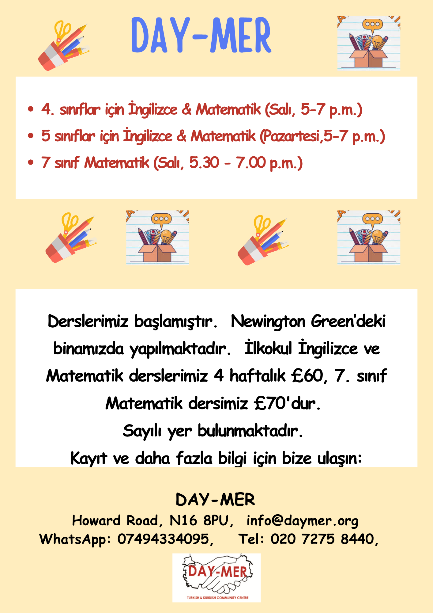 İngiltere’de on yıllardan beri eğitim alanında uygulanan sistematik kesintilerden dolayı maalesef öğretmenler ek desteğe ihtiyacı olan öğrencilerle yeterince ilgilenememekte. Ebeveynler ise hem müfredata hem de İngilizce’ye hakim olamadıkları için çocuklarına isteseler de ihtiyacı olan desteği sunamamaktalar. Day-Mer bünyesinde verdiğimiz kurslar çocuklara eğitim hayatının daha başında ihtiyacı olan motivasyonu ve teşviki sağlayarak özgüvenlerini kazanmaları ve eğitimde başarılı olmaları için destekliyoruz.
